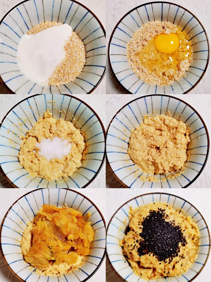 食材:西麦燕麦麸皮75克,红薯泥230克,鸡蛋一个,牛奶15克,白糖8克,黑芝麻15克