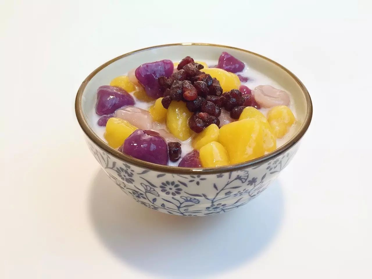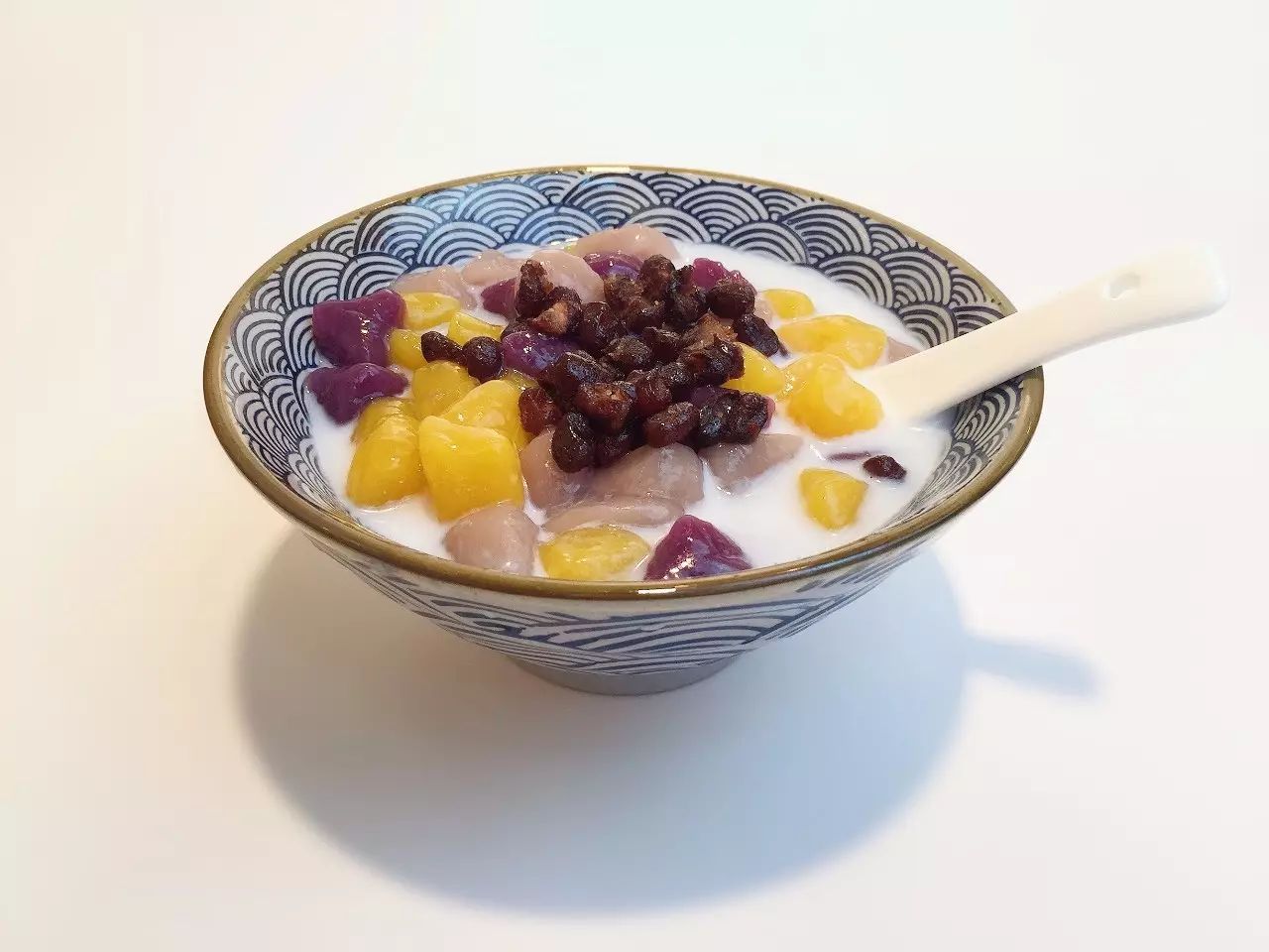 碗中倒入冰牛奶、放入三色芋圆,芋头小方块,蜜豆,淋上炼乳。