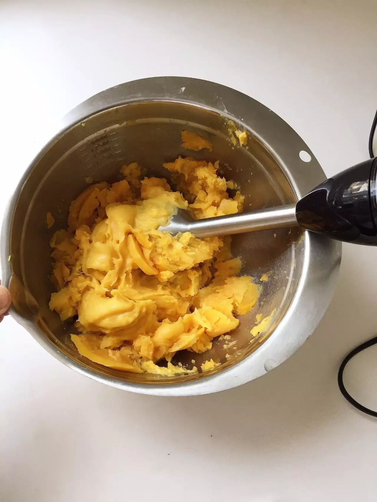 2 | 蒸后马上倒出按个人口味加入适量糖粉用料理棒打成细腻的泥状。芋泥含糖量低可略多加些糖粉,可随时尝一下甜度。(没料理棒的想法各种方法碾压成泥状。如擀面棍)