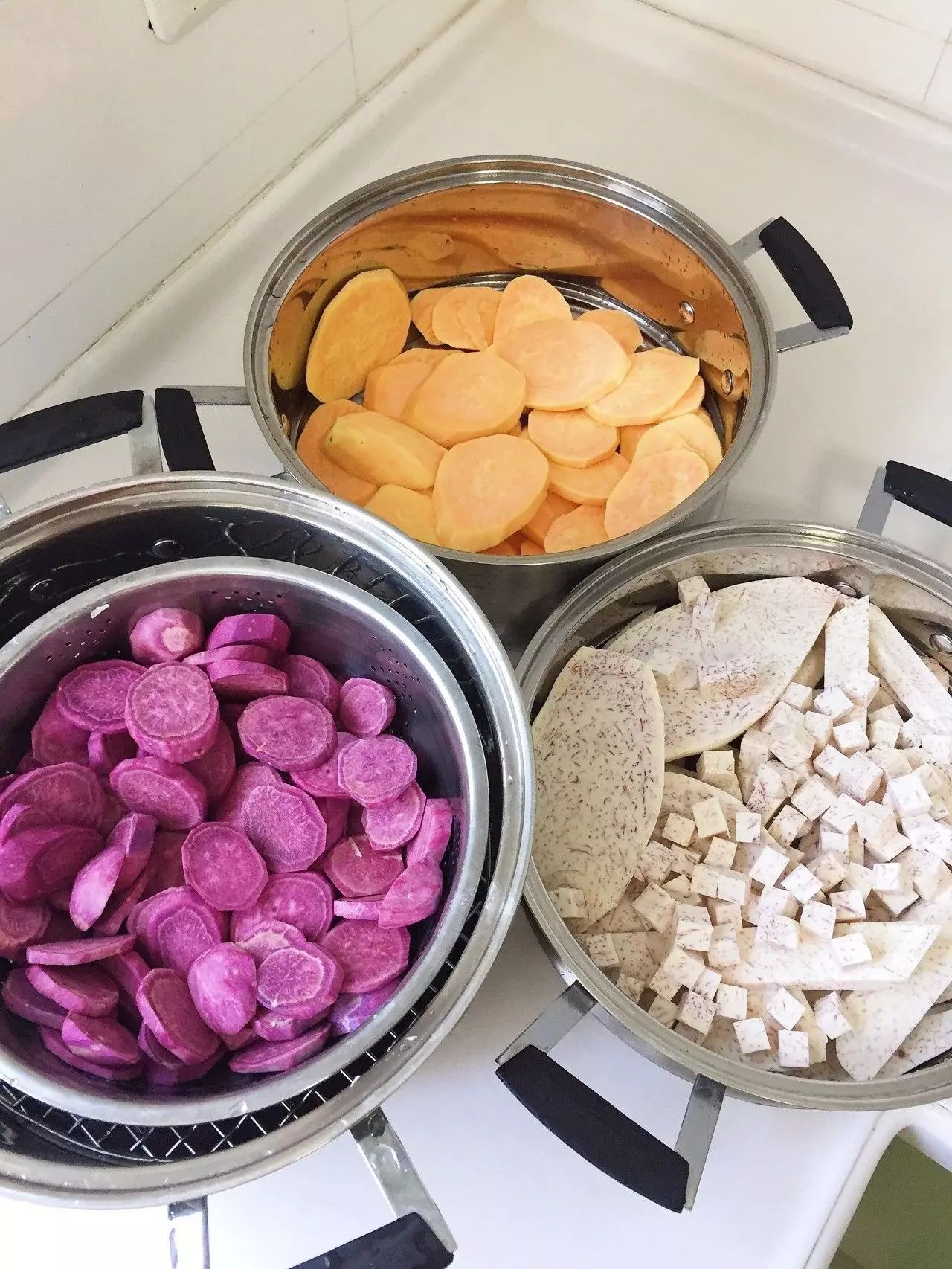 蒸锅中倒入适量水,放入红薯、紫薯、芋头,大火烧开转中小火蒸熟,约15至20分钟。