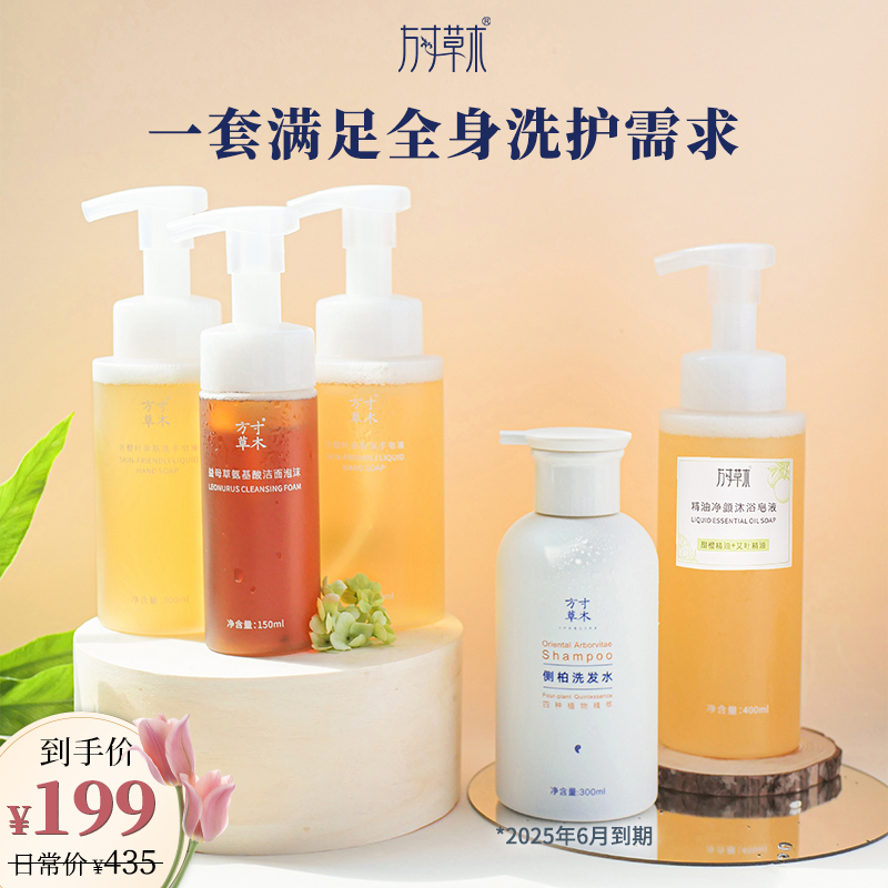 套装内容:洗发水*1+净颜沐浴皂液*1+洗手皂液*2+氨基酸洁面*1