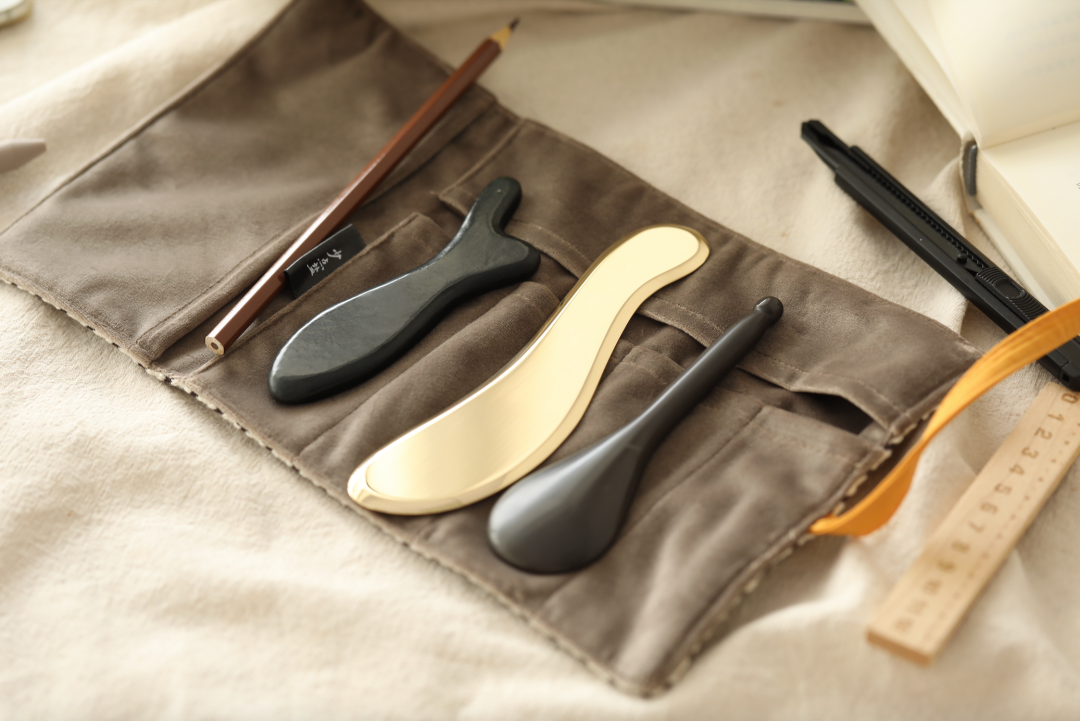 按照下面设计图的顺序安放三个刮痧板,收纳时,可以避免最硬的黄铜刮痧板与其他两款刮痧板产生过多碰撞