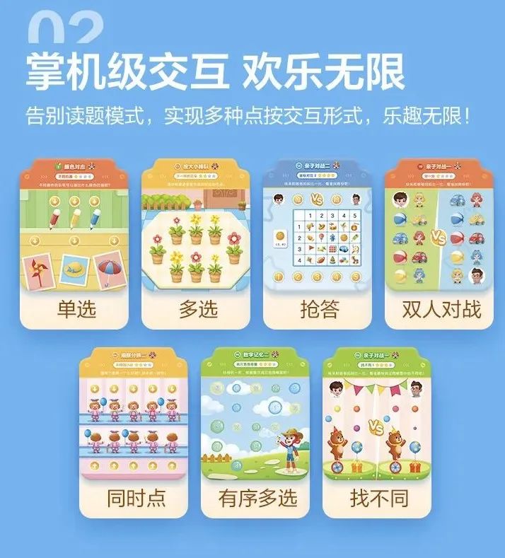 洪恩逻辑派包括超过1400个思维闯关游戏。设置了单选、多选、同时点、有序多选等不同的交互点按方式。zui厉害的是,不仅可以单人挑战,更能进行双人对战!
