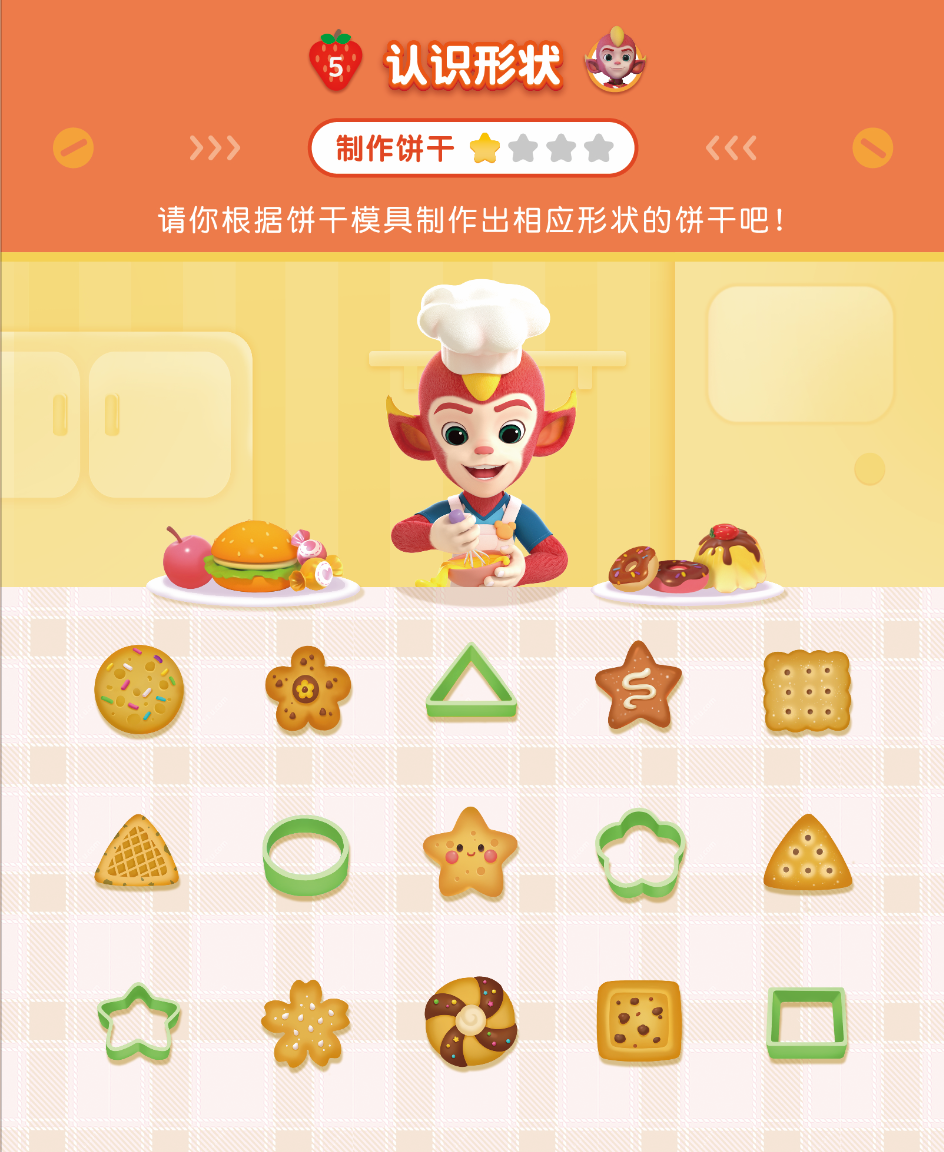 比如一星初步感知不同形状,二星则在原有认知的基础上,通过重复和叠加的方式,夯实之前的知识,同时增加新的知识点和难度。