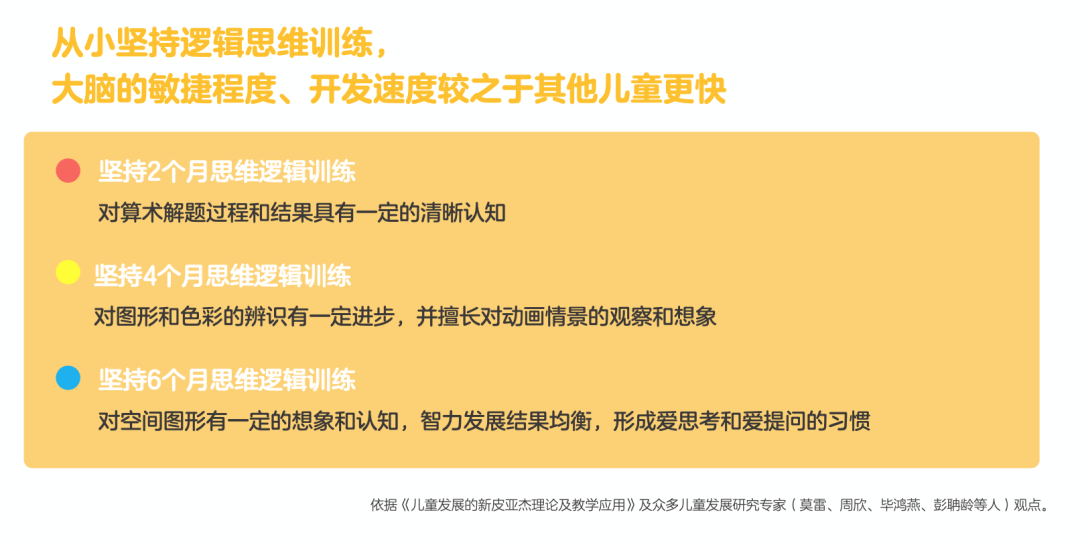 儿童发展研究专家们做过实验,坚持2个月、4个月和6个月的逻辑思维训练,孩子会在算术、空间观察和想象等不同方面比其他儿童发展更快。