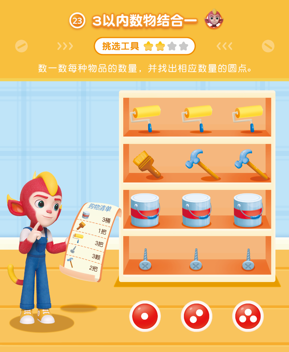 到了2星《超市小当家》,则是将数感问题代入到小朋友生活中常见的买卖物品的场景,让孩子充分的感知抽象的思维问题在生活中的实际运用。