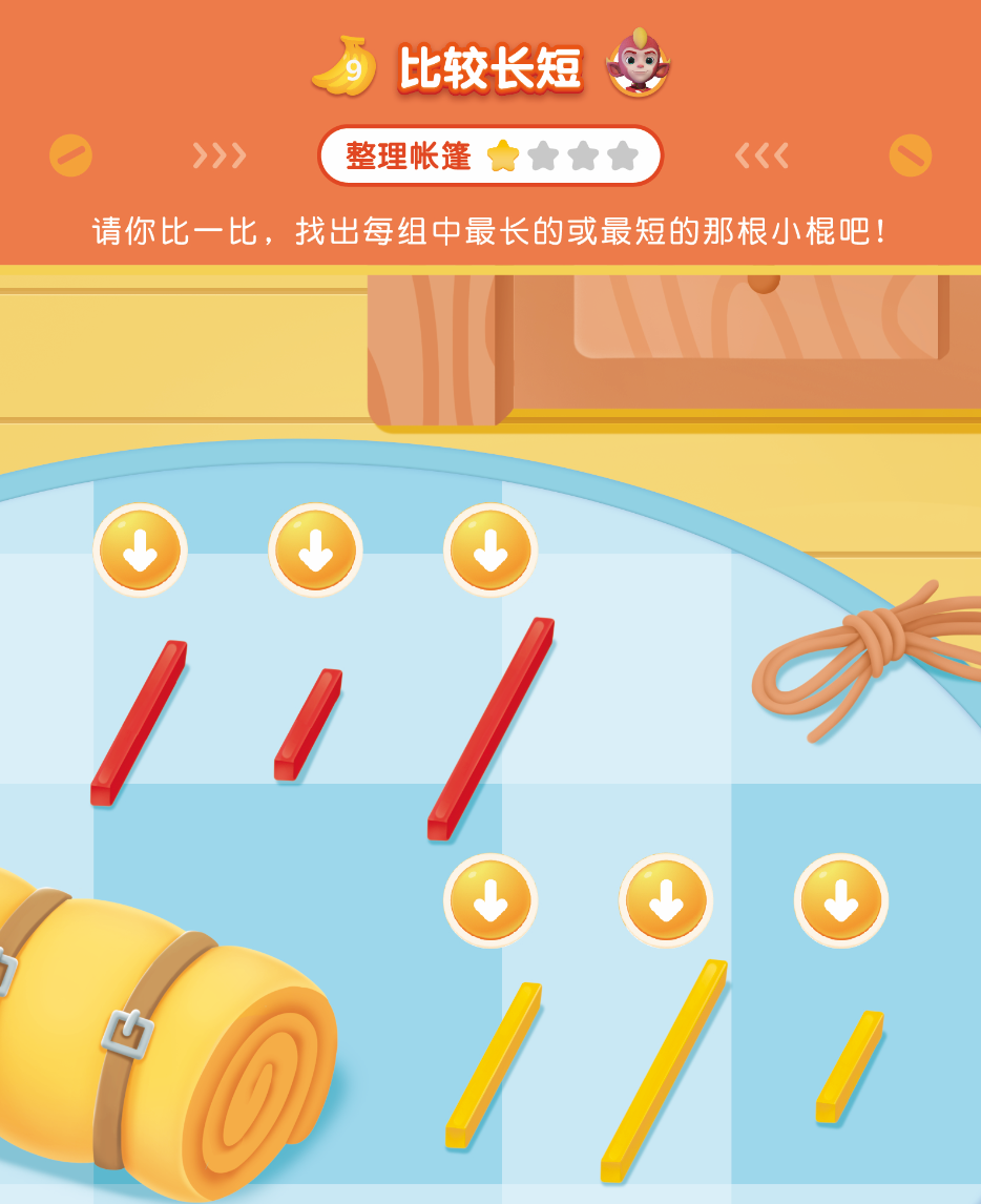 比如1星级《一起去郊游》,主要是教孩子认识颜色、感受大小、高低、粗细,感知数字。