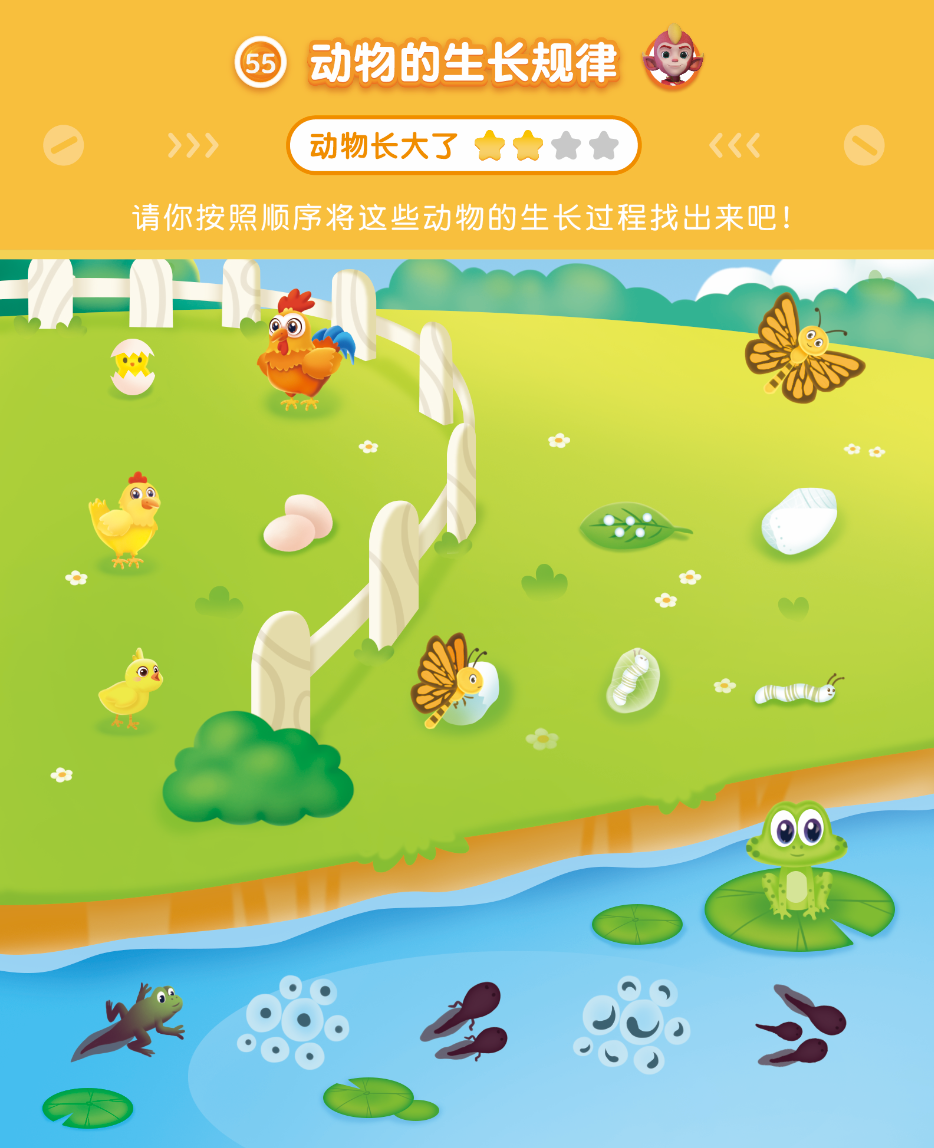 除了思维训练,还会穿插科学百科知识。比如(左一题卡),小朋友需要按照每个小动物的生长规律,找到它们的不同形态。