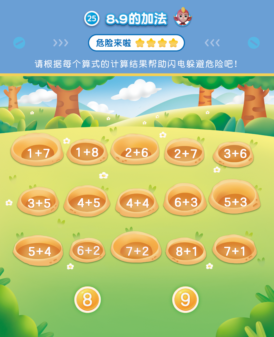 比如3星《寻宝大作战》主题,故事一开始,闪电发现了一张藏宝图,在寻宝的过程中,设计了各种惊心动魄的冒险情节:比如要打败图形怪,帮助时间精灵抓住调皮的小怪兽,还要寻找晕晕乎乎镇,打败怪人x博士,关掉让人变晕的机关….整个寻宝过程,小朋友需要运用20以内单双数、点数、找规律、观察对比、逻辑推理…等一系列思维知识去攻克关卡。