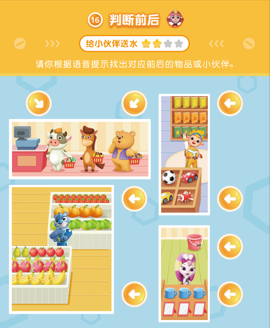 比如(左二)在超市排队,根据提示找出对应前后的物品或者小伙伴,帮助孩子理解前后不同的空间概念。