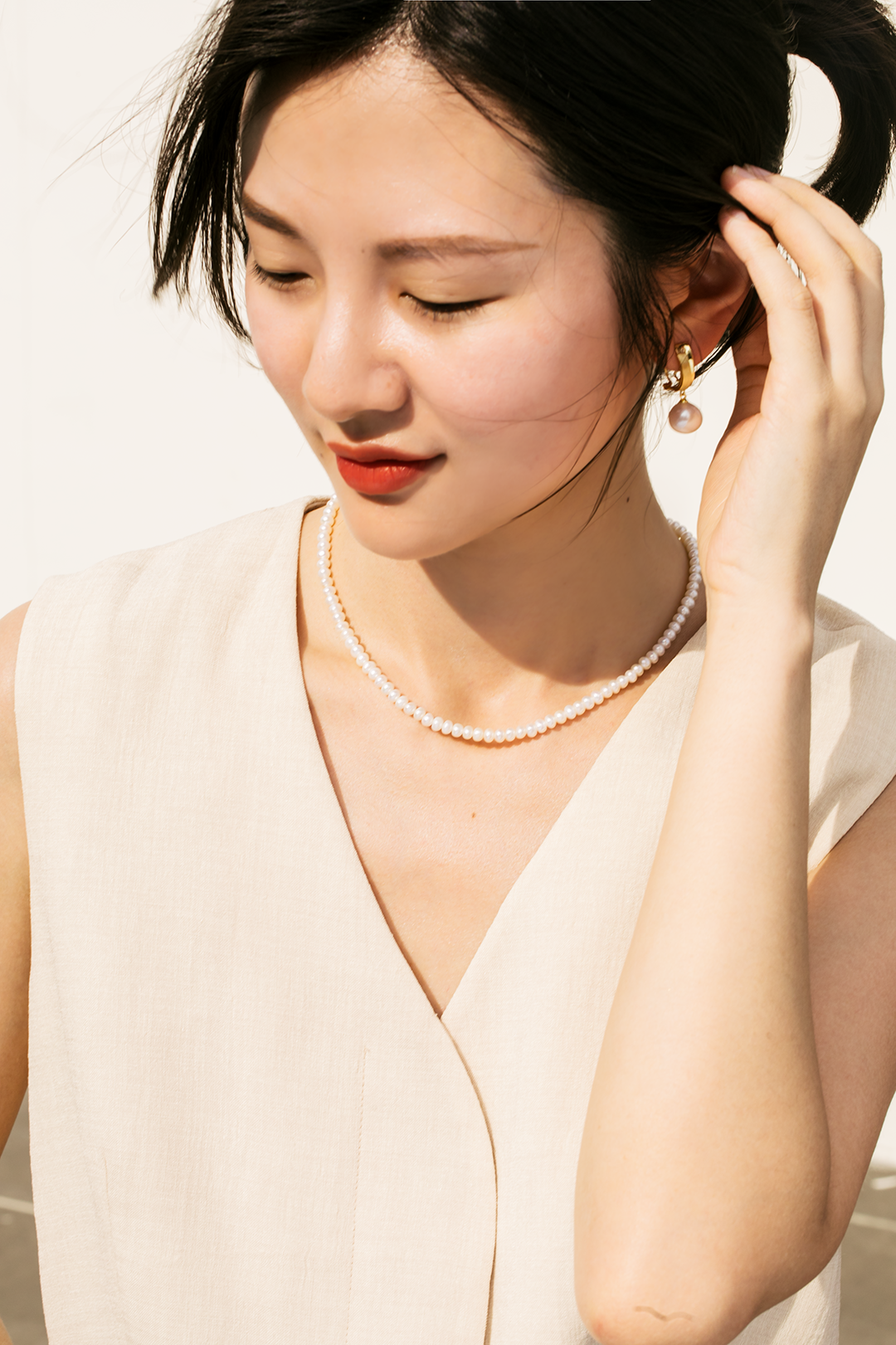仔细看它的珠子,能看到一点香槟色的光泽,透着淡淡的粉光。在七月份的阳光下,它的柔光像一颗颗小灯泡,给脸颊也打上了一层珠光。▼