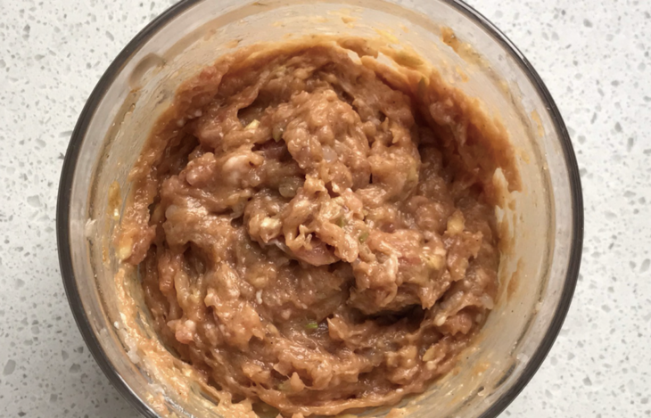 2、将猪肉馅与虾混合后添小葱花,1/3勺姜末,2勺熟豆油,1勺生抽,1小捏花椒面,1大捏十三香,1捏盐,1枚鸡蛋,1两半的水;