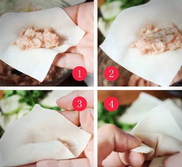 1、取出馅,将其放入馄饨皮上,将中间卷起,捏好两角;