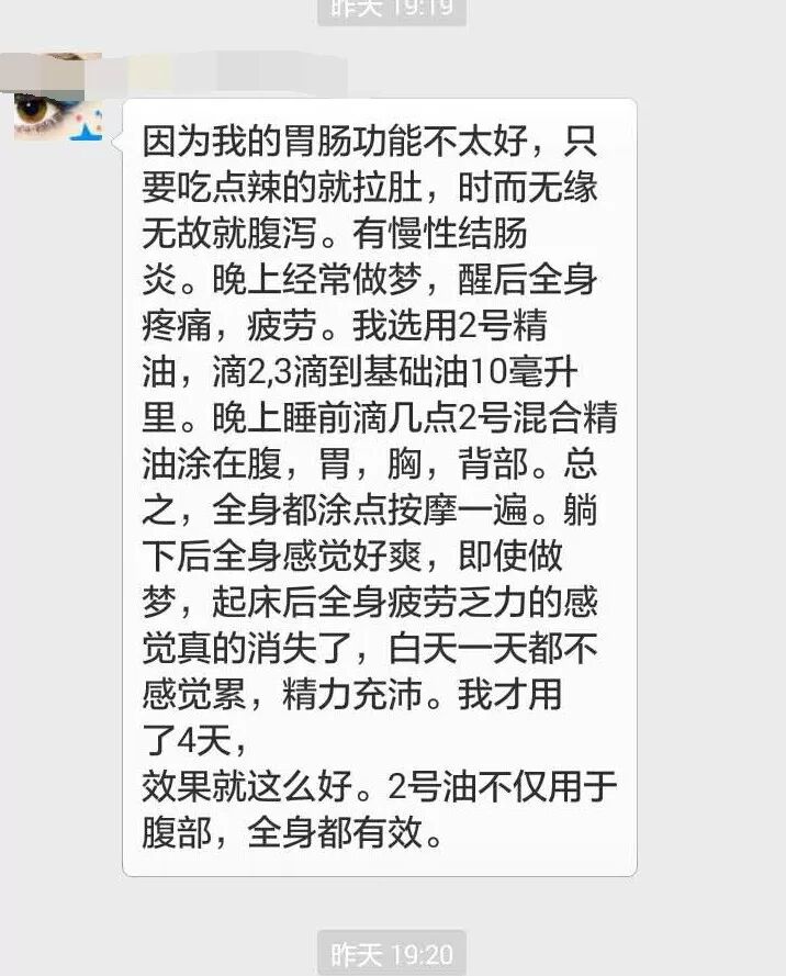 【用法】每日早晚各一次,饭前或者饭后1小时,取15-30滴,涂抹在整个腹部,按摩至吸收。