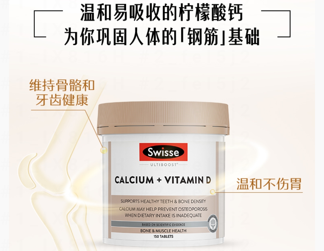 柠檬酸钙 Swisse斯维特澳洲钙+维生素D:不添加激素,温和不伤胃,中老年骨关节不适、骨质流失以及孕期都可补充。有机柠檬酸钙有助于骨骼中的钙吸收,特含维生素D3维持正常的血钙和磷平衡。