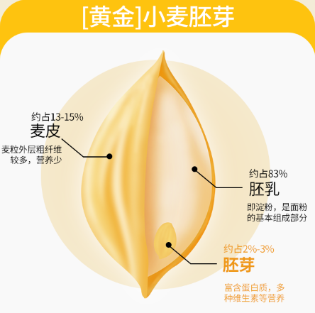 小麦胚芽就是小麦外表皮和胚乳之间薄薄的一片,是小麦生命的根源,位于小麦下端仅占麦粒重量的2%-3%,但营养却占其65%左右,是小麦中营养价值高的部分。