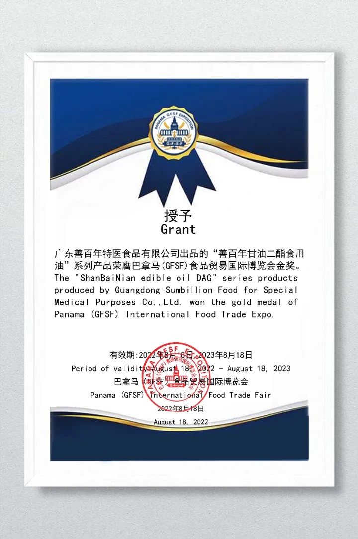 行业首例丨“善百年甘油二酯食用油”荣膺巴拿马食品贸易国际博览会金奖