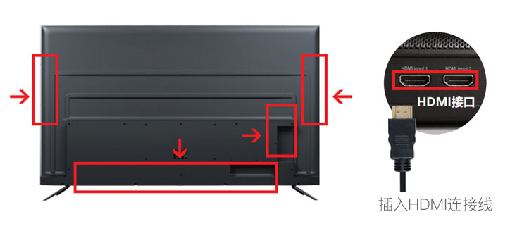 HDMI接口一般常见位置如下图箭头所示,在电视机的左右两侧,背部凹槽,或底部,标有“HDMI输入”的字样。