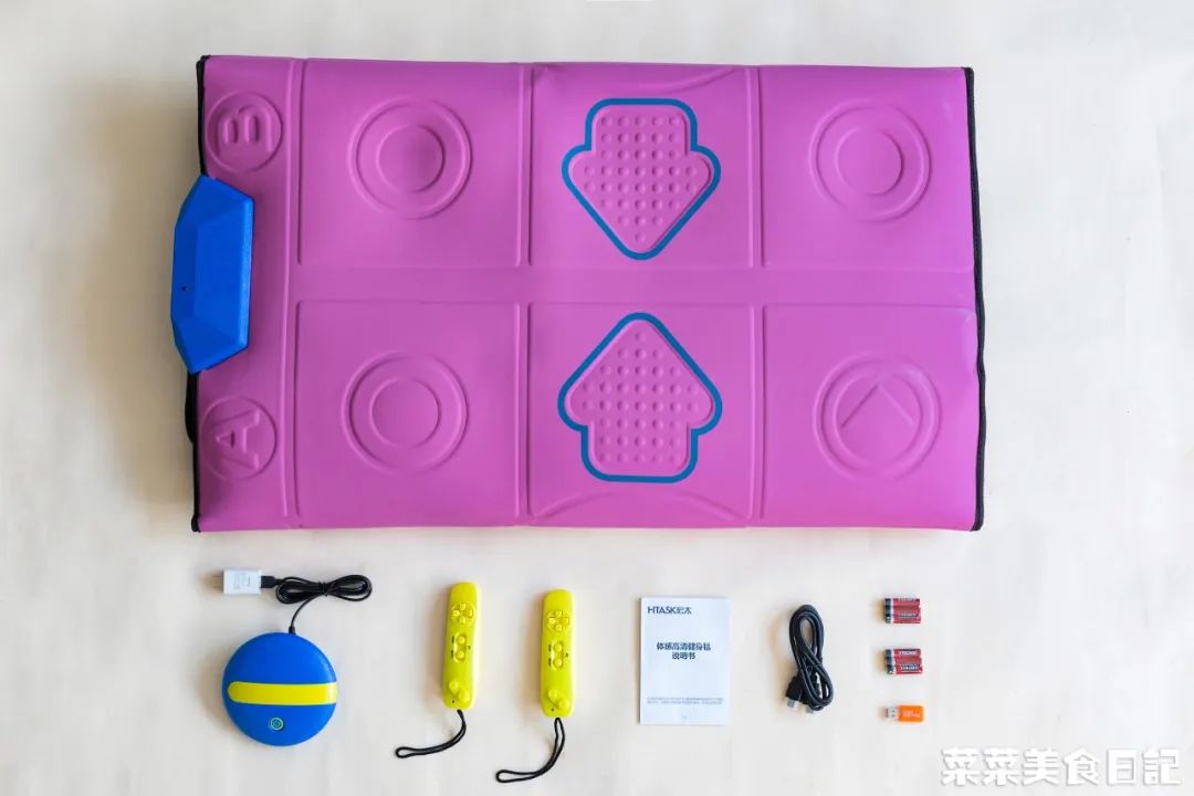 以下是全部的配件,毯面*1,主机盒*1,游戏手柄*2,说明书*1,HDMI连接线*1,7号电池*6,读卡器*1。