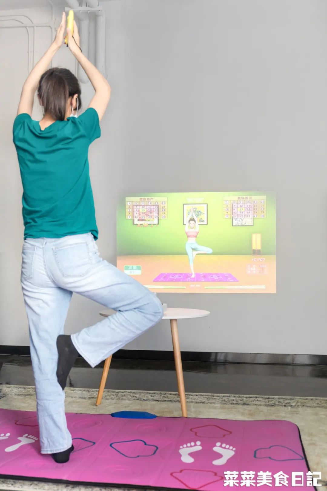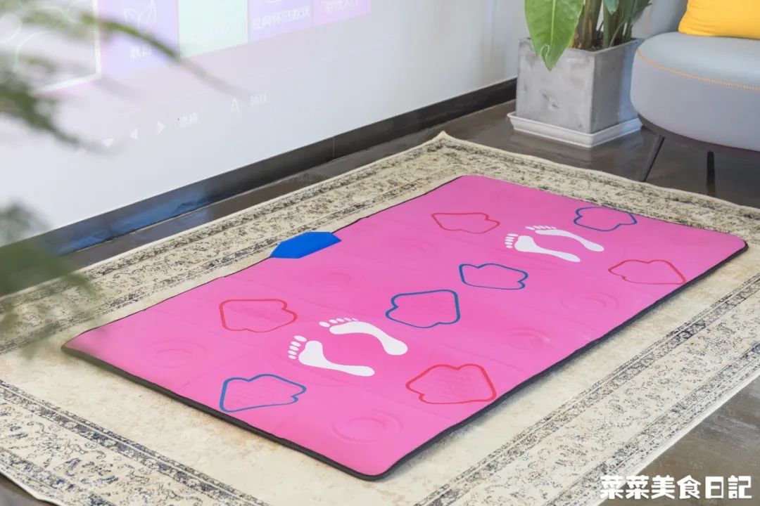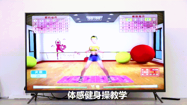 做健身操,配合体感毯的体感键,踩踏毯面箭头,“教练到家指导”!