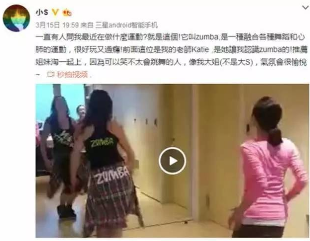 再给大家看看小S吧,自从迷上了尊巴舞,一个月之内连Po好几条微博了,几乎每天都在练!