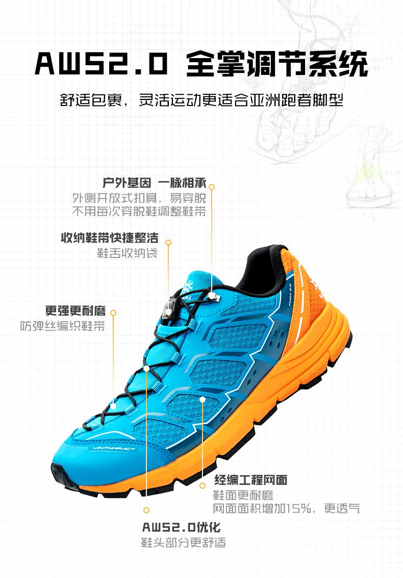 采用高耐磨人造皮设计,高透气耐磨网布,无缝连接鞋面,在越野跑时候足以保护双脚,适应复杂的未知路况,长距离多次穿着鞋子也可得到很好保护。