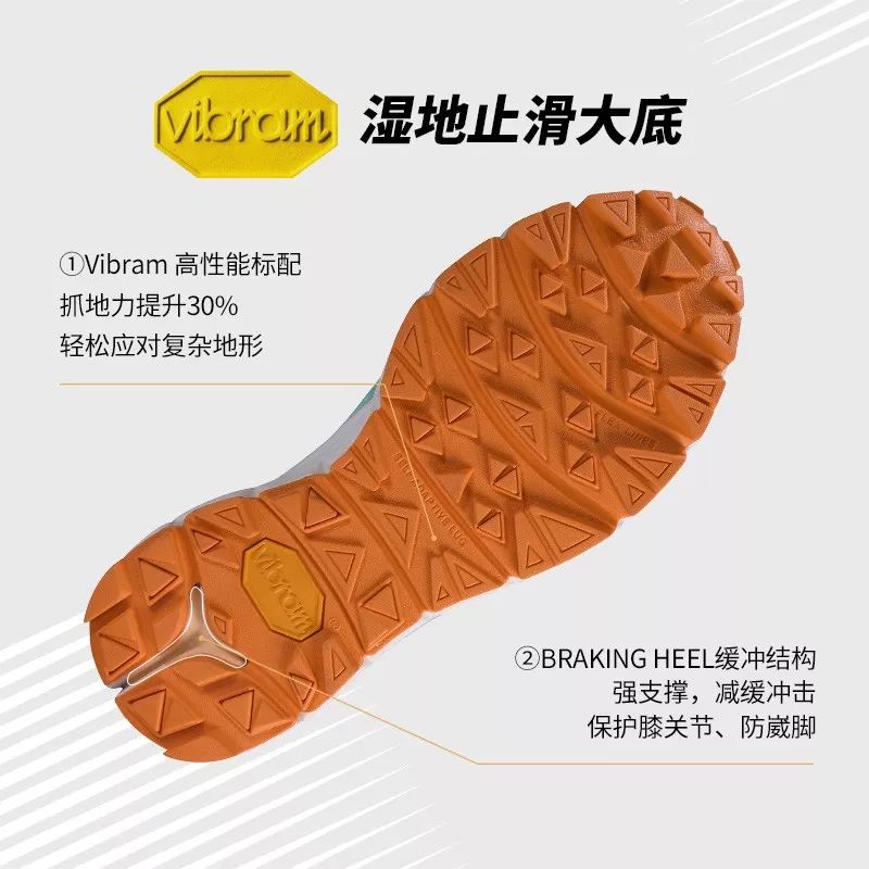 采用 Vibram 最新研制出新橡胶配方 Megagrip 鞋底,无论干地湿地都有很强的抓地力、防滑性,解决了必需湿滑表面摩擦力的户外活动难题。