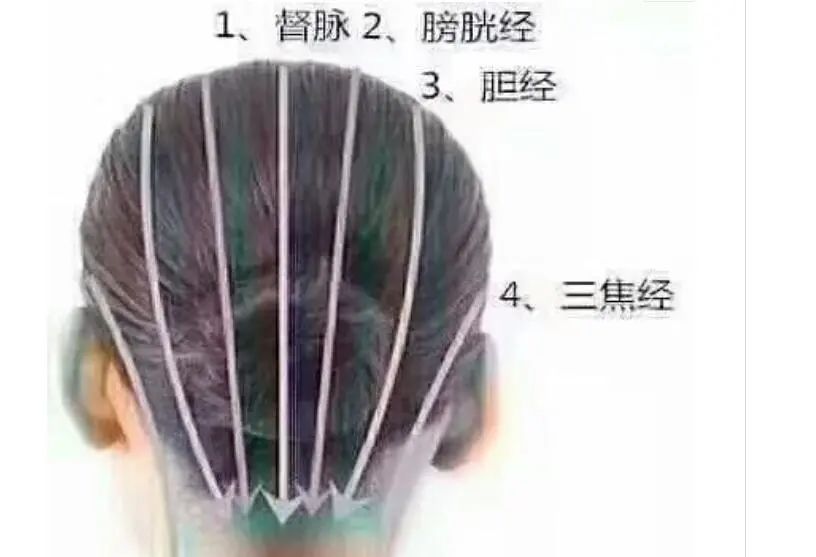 头部这五条线,从前往后梳,从耳际往后刺激三焦经(两边都要梳),每条线梳5~10次。