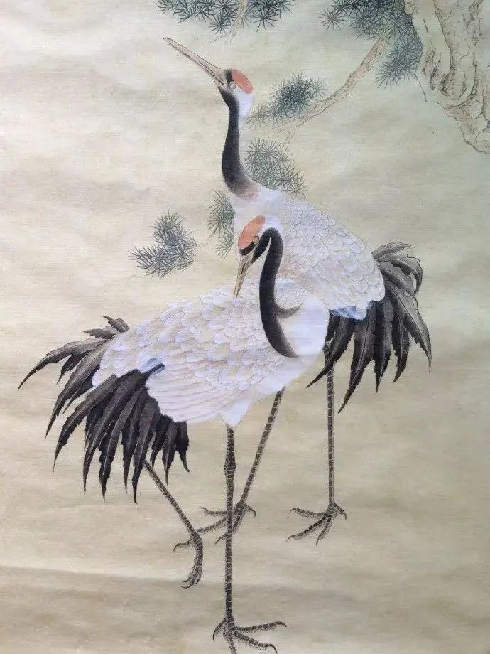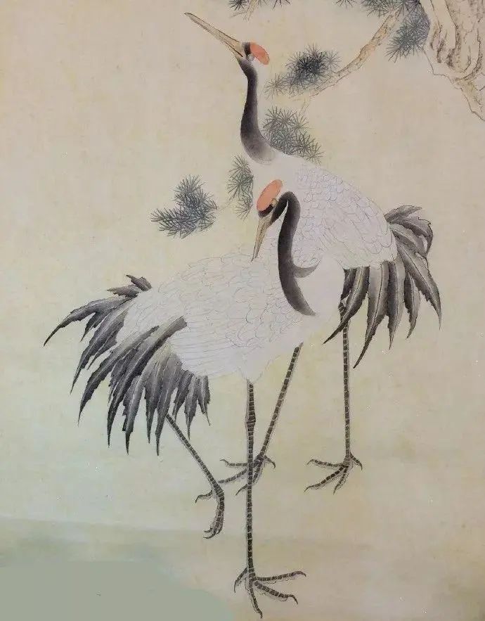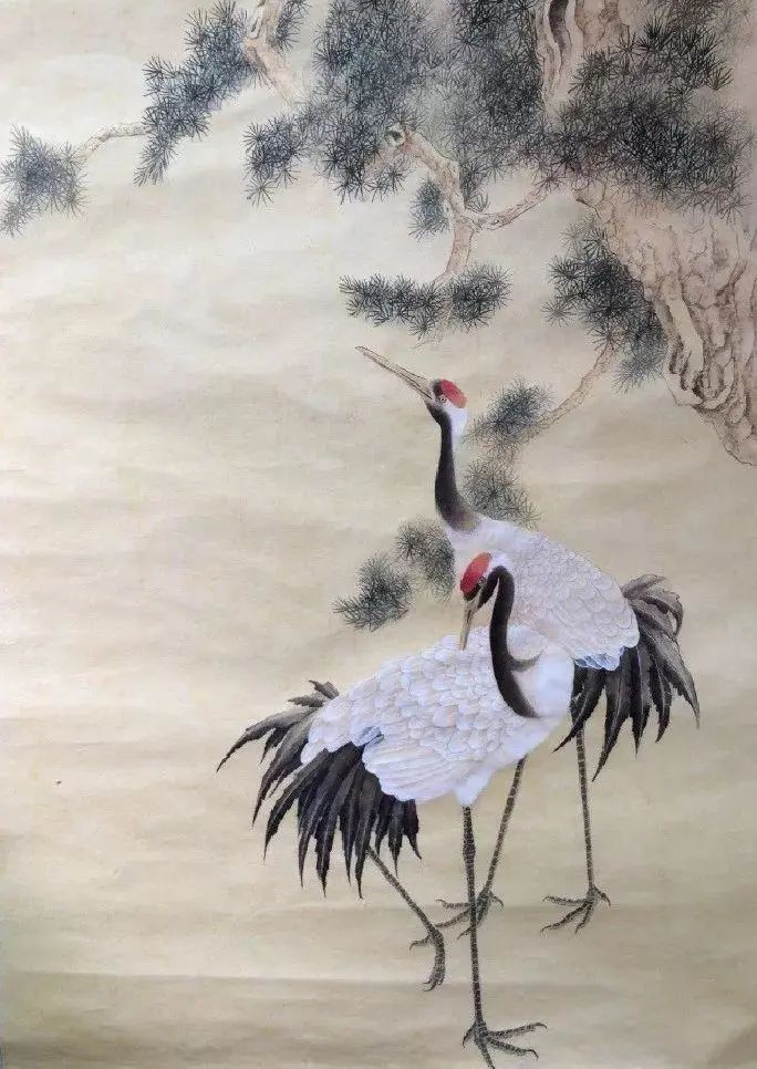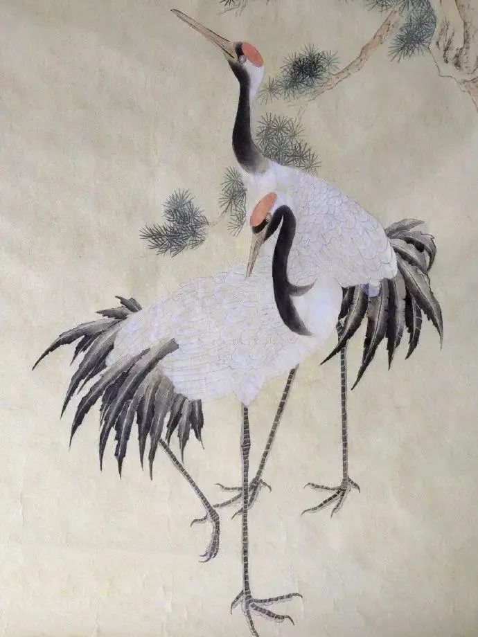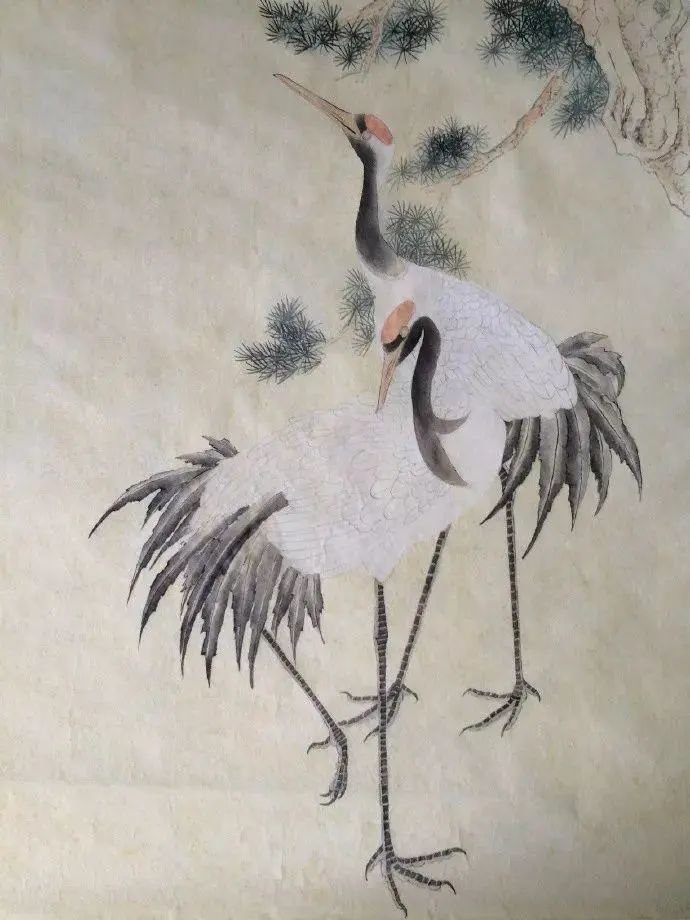 第十一步:仙鹤头冠用曙红分染一次,然后用胭脂点染。脖颈根部用赭石分染,腿爪及黑翎用花青罩染。黑翎用钛白勾线,眼睛用浓墨点睛,钛白点亮光。部分羽片用赭石分染,钛白提亮,钛白勾羽片的羽筋。部分枝干用干笔蘸淡墨略加皴擦,赭石分染。重墨丰富局部松针,增加松叶的厚重感。最后整理,完成。
