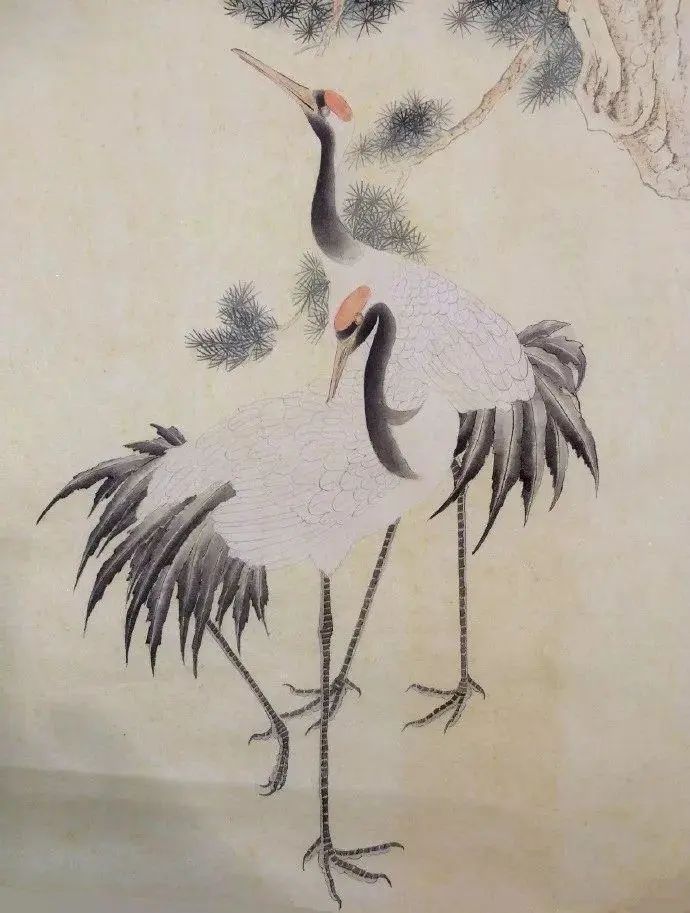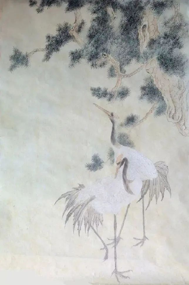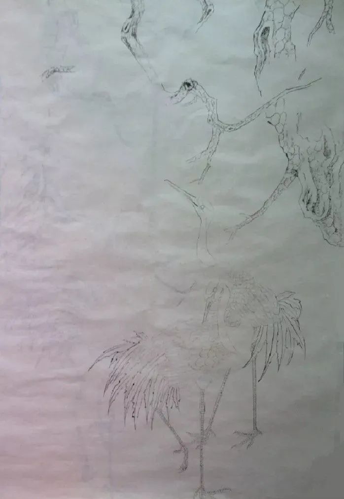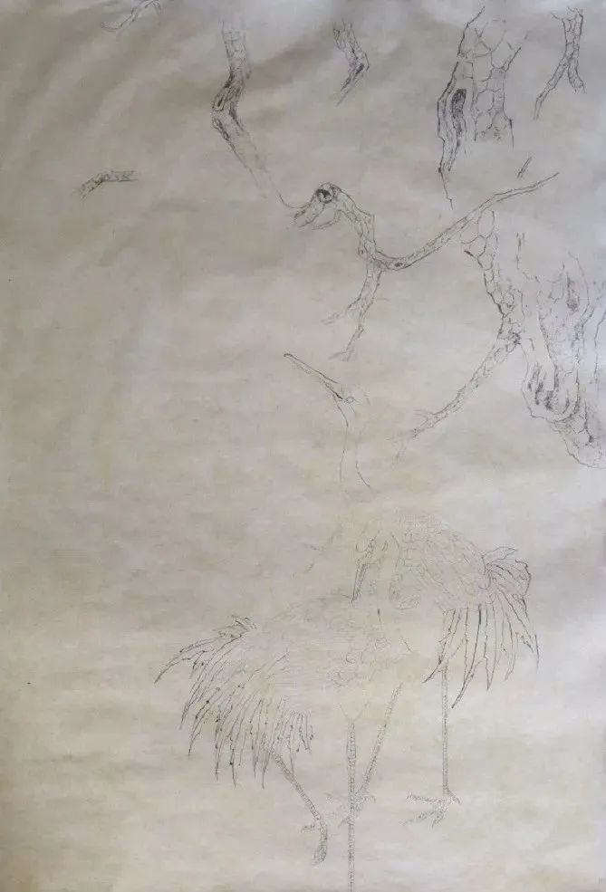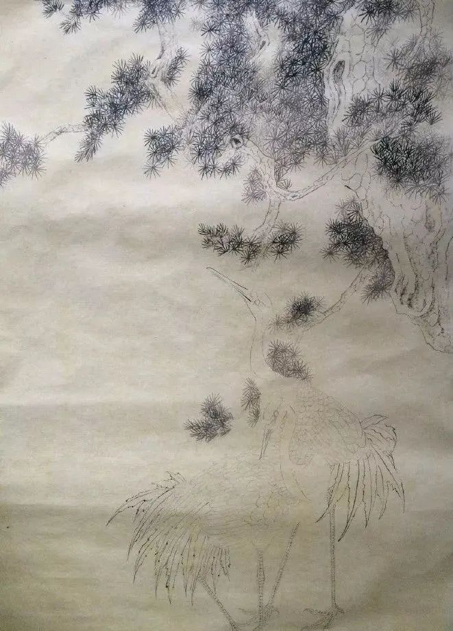 第一步:白描。松树用略干的枯笔勾线,落笔时按笔用逆笔的笔法行笔,树干的鳞片大小要有变化。勾线先勾树干,然后枝干,勾线之后用侧峰略加皴擦,勾线时注意墨色的变化。用中墨勾画仙鹤,腿爪及黑翎用重墨勾线。