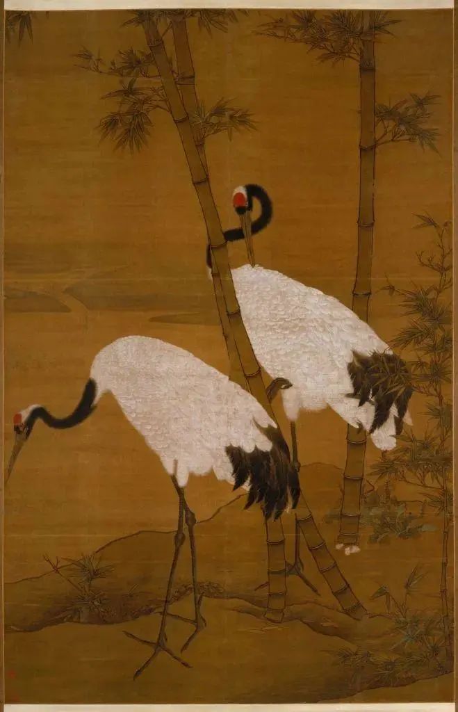 图中一对仙鹤姿态优雅,轩昂高洁,在翠竹间怡然自得。画家以工细的笔法描绘仙鹤的形象,高超的技法使笔触融汇于物象之中,仙鹤洁白轻盈的羽毛片片分明,好似浮在画面之上,令观者屏息凝神。仙鹤的头颈与尾羽处则用重墨,再加上鹤顶的一点丹红,格外醒目。画竹以墨笔双勾再施色彩。全幅设色对比鲜明,整体画风是边景昭的典型风格,承继了五代黄筌以及宋代画院花鸟画的富贵品貌,带有浓郁的宫廷气息。