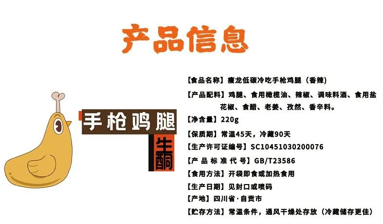 我们的手枪鸡腿的配料表非常干净,只有:鸡腿、食用橄榄油、辣椒、调味料酒、食用盐、花椒、食醋、老姜、孜然、香辛料。