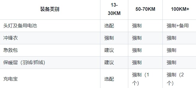 根据ITRA及国内主流赛事标准,强制装备可分为以下五大类,新手需按组别(短/中/长距离)调整配置。