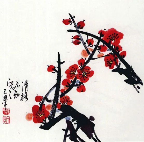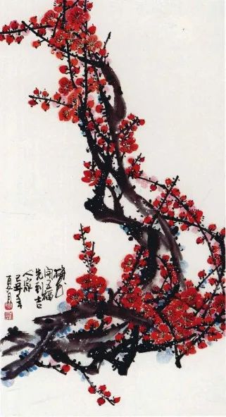 聚散:是指集中与分散的关系。画梅花,花朵的分布必须有聚集在一起的,有疏落分散的,聚散之间要互相联系,做到聚而不塞、散而不散,才能富韵律,引人入胜。切忌平均分布、散点布局。