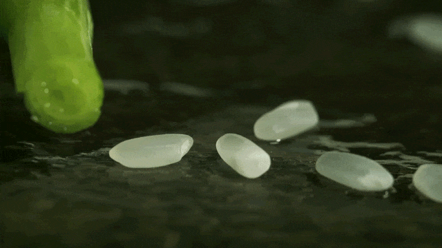 以大约1:1.2比例将米和水加入到电饭煲中。米粒在水的冲刷下不断翻滚跳跃。
