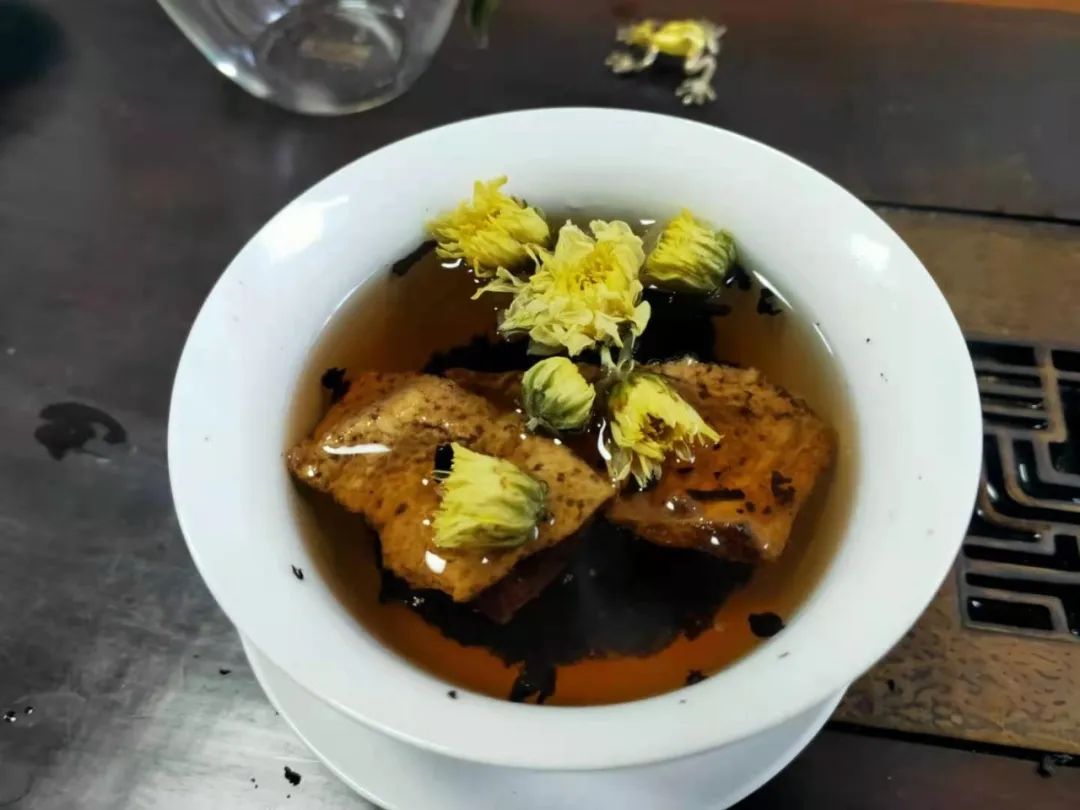1、将陈皮、普洱、菊花,投入盖碗中,冲入热水,微微闷泡一下,让陈皮与茶慢慢苏醒