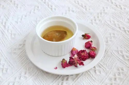 2、陈皮、玫瑰花放入有盖的杯中,用刚煮沸的水冲泡,拧紧杯盖,闷15分钟即成,代茶饮,当日喝完。