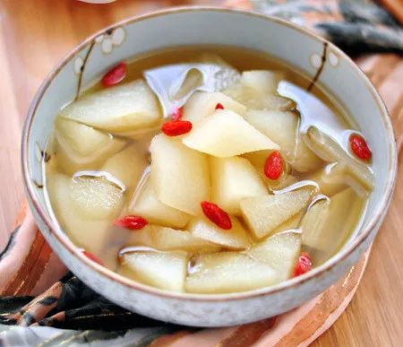 4、 下入梨肉和冰糖,大火煮开,转小火慢煮5到10分钟,至冰糖全部融化,关火后,加入枸杞子,即可。