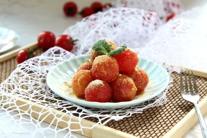 4、取出逐个放入陈皮粉中滚几圈,使圣女果沾满陈皮粉取出即可食用。