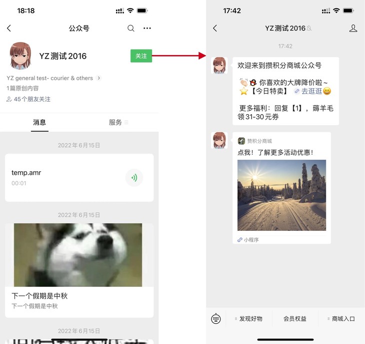 2. 目前关注后仅支持设置回复一条消息, 升级后可设置3条不同类型的消息,支持回复粉丝文本、小程序卡片、图片、图文等消息。
