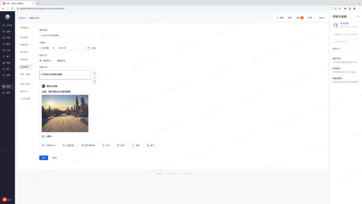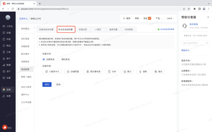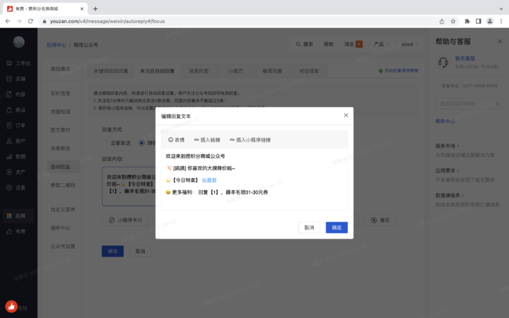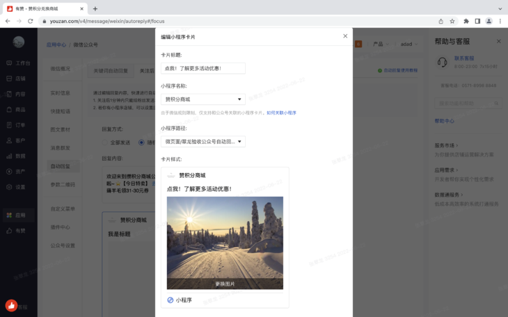 1. 目前有赞提供的公众号自动回复能力不支持小程序卡片,但很多商家在微信环境内都有微信小程序,且以微信小程序为主。