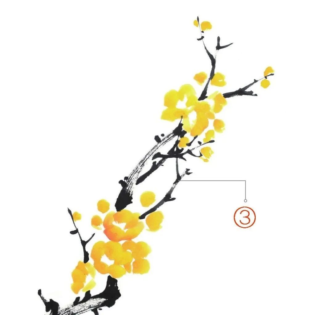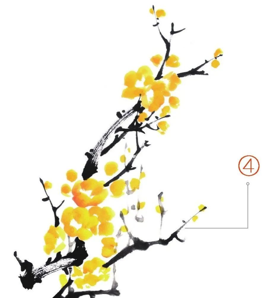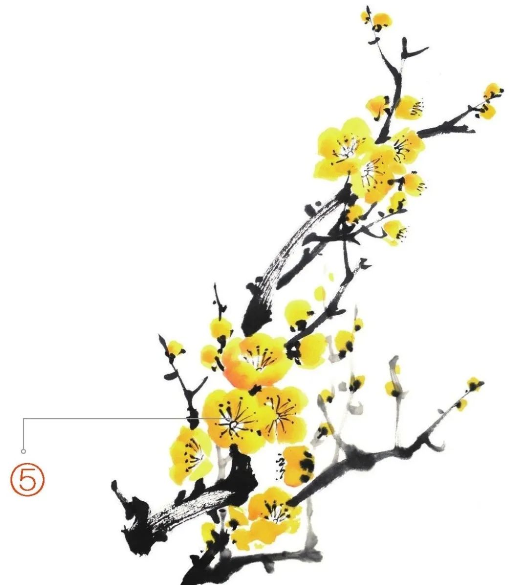 如前文所说,腊梅花色大多为金黄至浅黄。所以在写意腊梅时,其花色多由 藤黄+赭石调配。