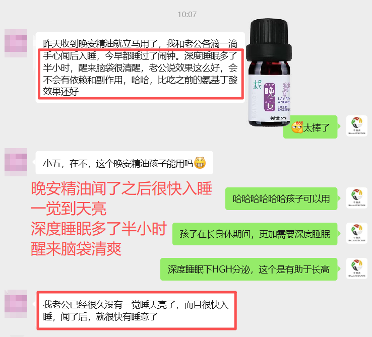 晚安精油后的反馈:晚安精油很好闻,闻了之后很快入睡,一觉到天亮,深度睡眠多了半小时,醒来脑袋清爽