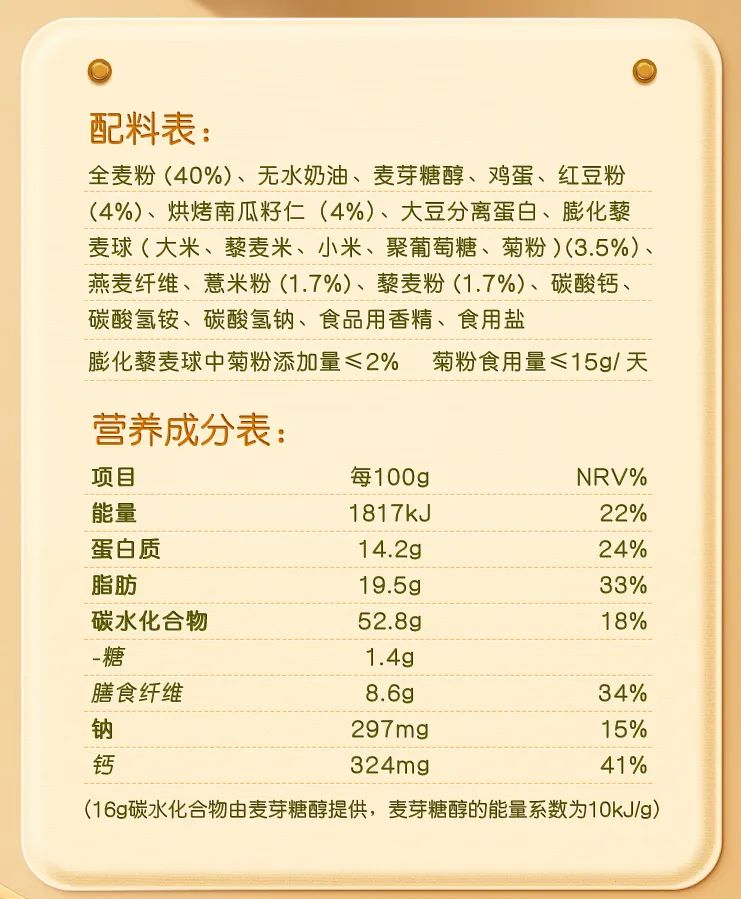 低GI藜麦饼干配料表及营养成分表