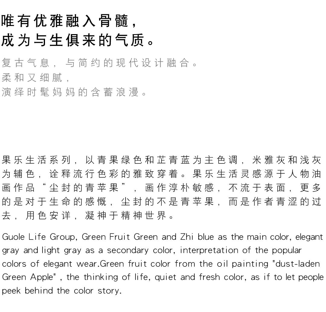 让中国女性成为精致、优雅、知性与艺术品味兼备的高感性人群,我们对品质的要求和产品的创新,提供的不仅是服装本身,而是一种全新的生活方式和生活理念,是推动和引领潮流趋势的载体。