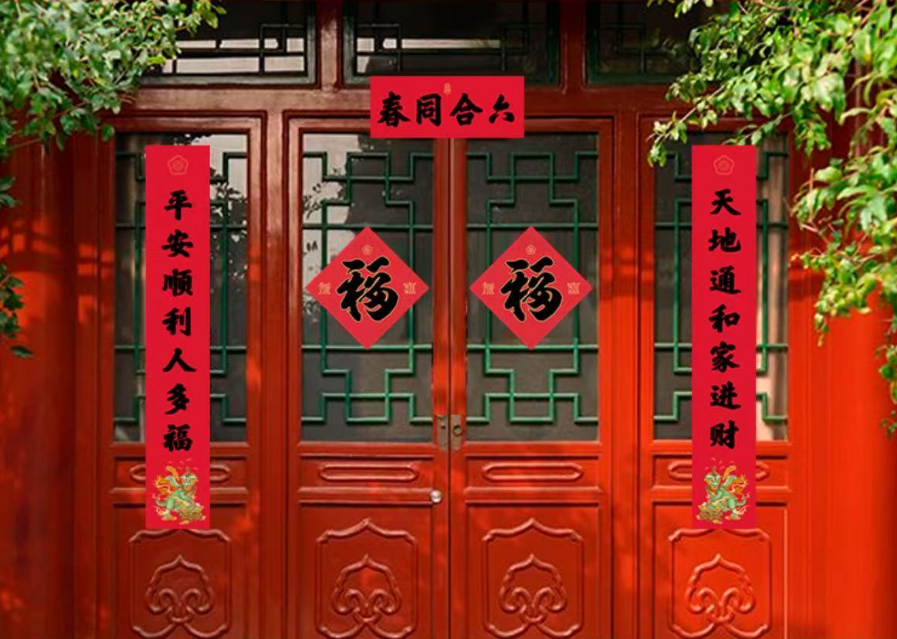 贴春联源于古时在大门两边悬挂用桃木做的“桃符”,上面分别刻着传说中的降鬼大神“神荼”和“郁垒”,具有驱鬼压邪之意。