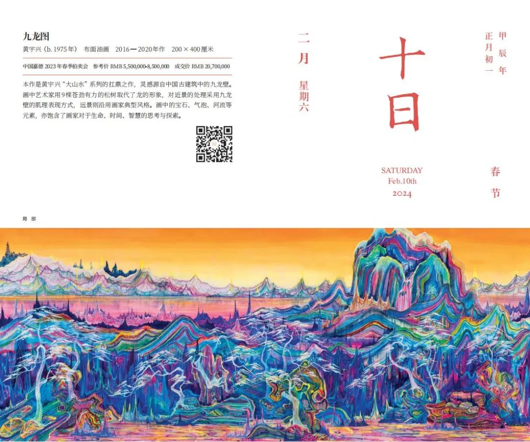 《嘉德日历2024》书腰精选艺术家黄宇兴巨制布面油画《九龙图》。在黄宇兴的笔下,与古建筑相依附的壁上“九龙”化意成九松,融入以炫目的霓虹色调呈现的大山大河间。“九龙”这一古代元素被黄宇兴施以当代色彩后,更强烈地传达出蒸蒸日上的盛世景象。借助这一巨制,我们殷切地希望为大家送去新一年最美的愿景。九龙图