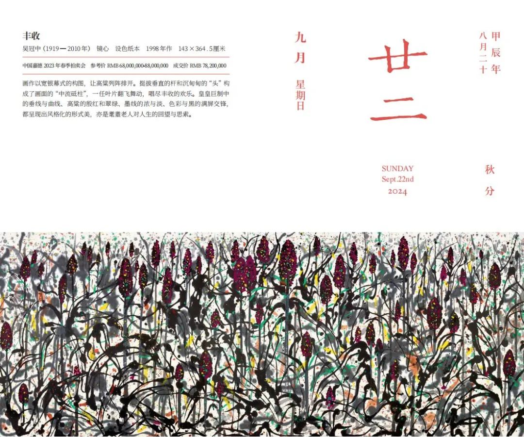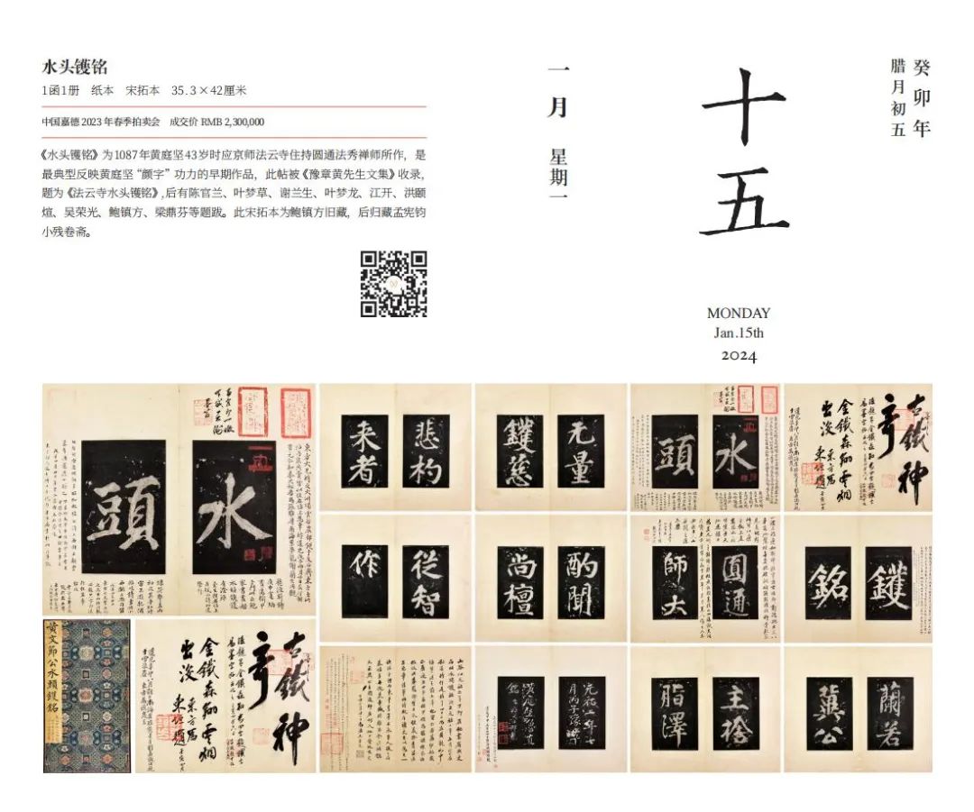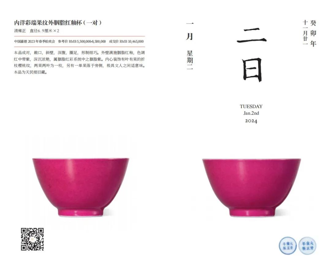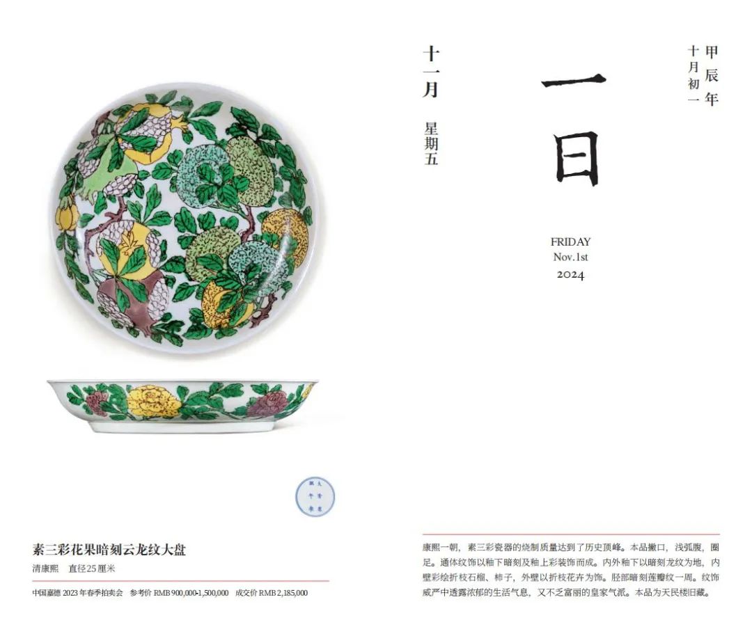 《嘉德日历2024》每月月首经特别策划和设计,画面雅致,寓意吉祥。其题材来源于2023年春拍《众山皆响——画中九友册》、“天民楼”藏瓷、齐白石《老舍旧藏花虫人物册》。“画中九友”源于明末清初诗人吴伟业《画中九友歌》对董其昌、王时敏、王鉴等九位书画家的赞颂。至20世纪,重要鉴藏家吴湖帆耗费巨资,历时15年终于实现其将“画中九友”画册搜罗全豹的心愿。此九册,含诸家题跋总计111开,吴湖帆统一装池、题签,并题跋84次,可谓众山皆响,九美毕集。本次拍卖,从8800万港元起拍,最终成交价为1.9113亿港元;所选天民楼“素三彩花果暗刻云龙纹大盘”乃清康熙时期御窑之器,华美而经典。“齐白石《老舍旧藏花虫人物册》”满纸生机盎然,承载着画家与老舍夫妇知音相交的真挚感情。