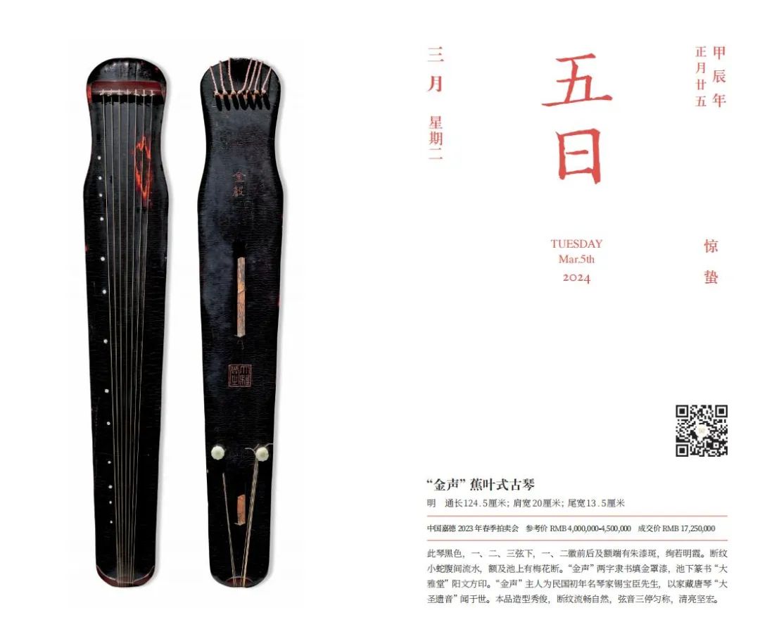 日历中重要的节日、节气,特别呈现应景佳作。在这些特殊的日子里,送上小小的惊喜与祝愿。2024年3月5日,“惊蛰”这一天,我们为您呈现锡宝臣旧藏、王世襄旧藏“明 ‘金声’蕉叶式古琴。伴着清亮坚宏的琴音,相信万物必将以昂扬的姿态苏醒;2024年5月4日“青年节”,特别选取寄寓美好愿望的“吴昌硕 篆书‘活泼泼地’”,来表达对青年人的殷切期望。2024年6月7日至8日,高考时节,我们借康有为的行书五言联“开张天岸马,奇逸人中龙”、李津的《战无不胜》,表达对考生金榜题名的祝愿。这样的安排还有很多,细心的您,定会在这些特殊的日子里感受到我们编排设计这本日历时的“小巧思”。