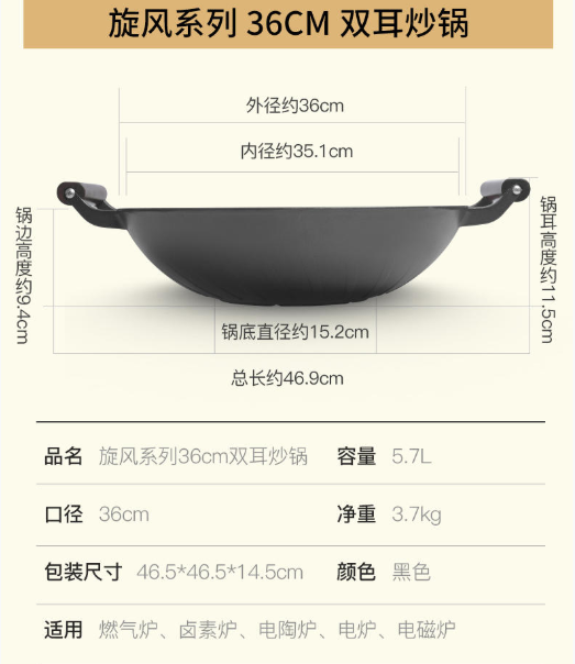 旋风系列炒锅分有32cm跟36cm尺寸,容量在同规格当中可相当于大家伙。平时烹饪4-5人份量都容易。家里来客人也不显小。